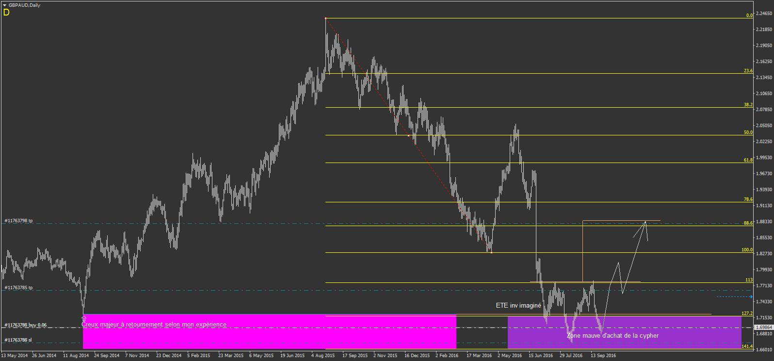 en faite, sur les 36 pages, c'est tout le cheminement depuis mes débuts, mais je n'ai pas tous poster non plus. il y a toutes mes interrogation depuis mes débuts, et les évolutions , les interrogation avec d'autre intervenant du forum, et du coup pleins d'idée mélangé, avant d'en arrivé à mes méthode de seulement maintenant lol. ca fait une belle aventure d'apprentissage. mais comme je le dis toujours, ne copier pas mes trade, je les poste car ca fais partie de mon travail de rigueur de mon trading, ca me force à être carré lol.je me vois mal reprendre toutes les page pour récupérer les trades vu que de toute façon y a un mélange de technique, surtout au début, même si la base reste le chartisme, on a ,avec d'autre, appris le chartisme, les figures harmonics, et j'en ai fait un mélange pour en extrapoler 16 Cas d'intervention ou d'analyse autour de 16 types de figure chartiste et de 7 figures harmonics. le tous me permettant de faire soit des cas d'intervention, soit des cas utilisé comme guide d'analyse avant les cas d'intervention. du coup en reprenant la file, serait long et inutile ...phi1618 a écrit :Après 36 pages, je pense qu'il fallait créer une liste des trades postés (gagnés et perdus) pour éventuellement savoir si cette stratégie chartiste porte réellement ses fruits.