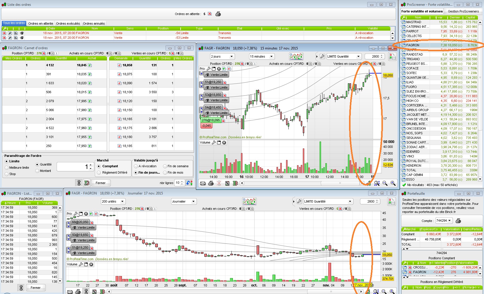 Mon choix ce soir s'est porté pour 5000€ sur le titre FAGRON, qui a marqué une belle hausse de 7,38% dans de beaux volumes, et a montré un engouement en fin de séance:Les ordres passés: