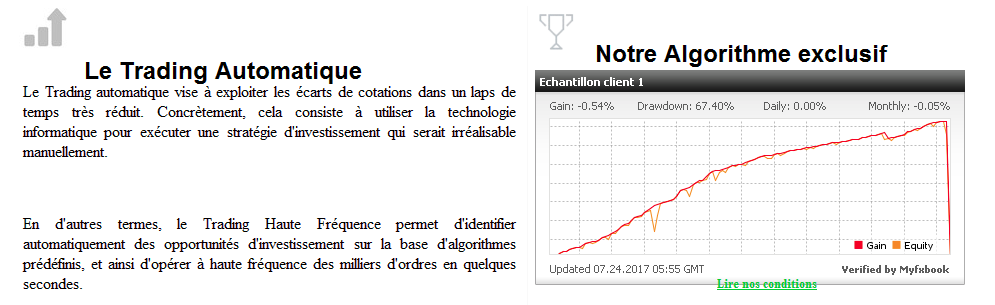 il est de mon devoir de mettre en garde sur une startup qui racole en particulier par le groupe facebook "TRADING AUTOMATIQUE MT4", groupe que j'avais trouvé par recherche et dont le nom laisse présager qu'il s'agit d'un groupe indépendant d'échange entre utilisateurs, mais qui semble appartenir dans les faits aux personnes de cette société.