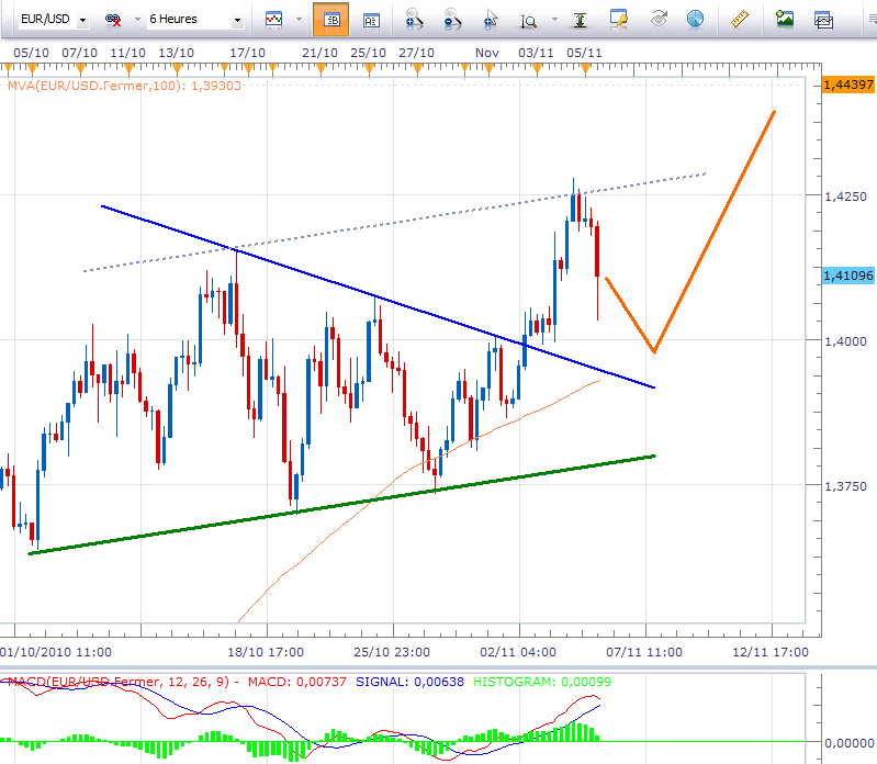 Néanmoins, la paire EUR/USD a perdu 1300 pips en l’espace d’un mois, les tensions en Corée, le cas Irlandais, la dégradation de la note du Portugal, les news pourraient être pricées par le marché. Si l’appétit pour le risque devait refaire surface, le cross serait donc enclins à repartir de plus belle.