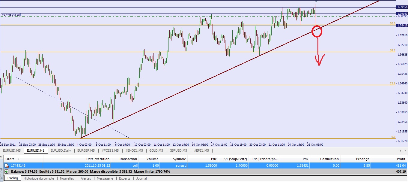 La cassure des 1.3650 déclencherait de nombreux ordres de vente en laissant le chemin libre jusqu'aux 1.3600. Nous sommes vendeurs sur la cassure des 1.3650 avec une première prise de bénéfice sur 1.3600. Comme il s'agit de contre tendance, la stratégie consiste à prendre une petite position, et de pyramider dans le cas où le mouvement prend de l'ampleur.
