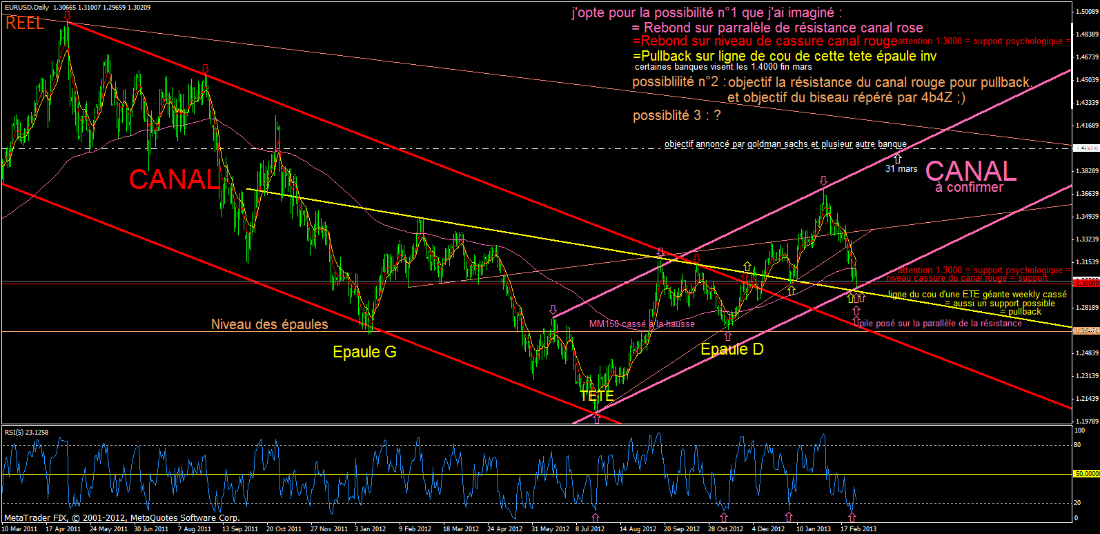 -ensuite on à atteind les 1.3000 qui correspond au niveau de cassure du gros canal rouge de mon graphique. le niveau de cassure peu servir de repère pour un pullback sur niveau de cassure.(on est toujour dans la tendence long therme créé par la cassure du canal rouge à la hausse et selon moi la baisse qu'on suis depuis 1 moi, serai juste une fluctuatuation classique). ce serai donc un achat sur pullback!
