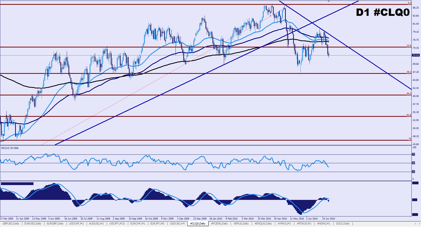 Nous nous dirigeons actuellement vers les 67$, 38.2% de retracement de cette dernière, zone qui a déjà été testée fin mai 2010.