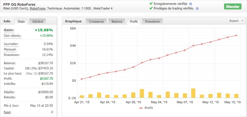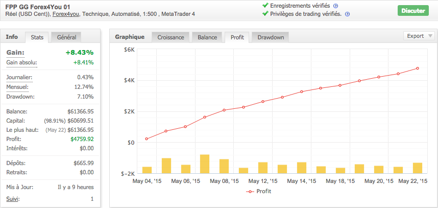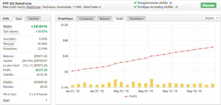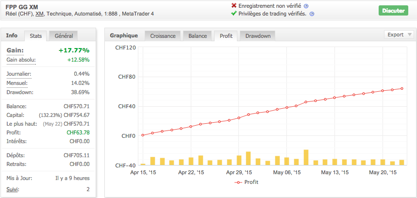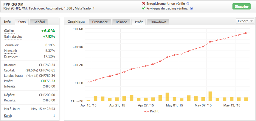 En fait s'il y a effectivement eu augmentation du flottant fin avril, dû à la remontée de l'EURUSD, la chute de la balance est un bug de MyFxBook. Il suffit de consulter l'onglet 'Profit' pour voir qu'il n'y a jamais eu de perte.