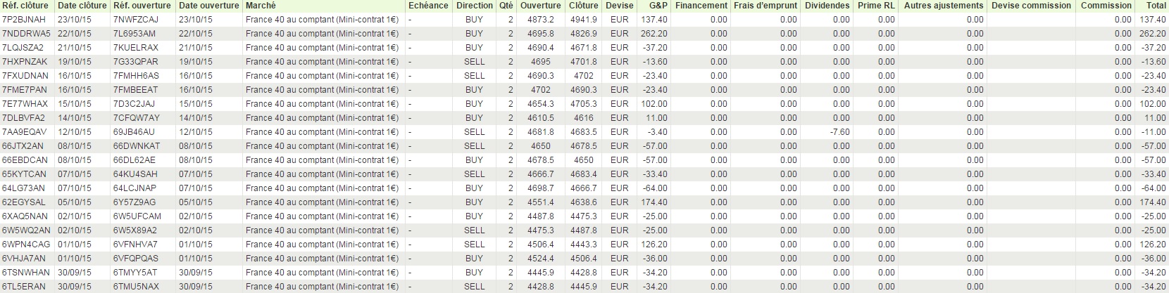 Après un très beau début de journée, le CAC a beaucoup baissé le soir, allant chercher notre stop loss. Dommage. Voilà les résultats en cours (pas de trade aujourd'hui car le range du matin était trop grand pour la stratégie):PS: dans le dernier message posté hier, le graphique représentait le backtest, alors qu'ici le graphique représente bien le trading réel effectué sur mon compte.