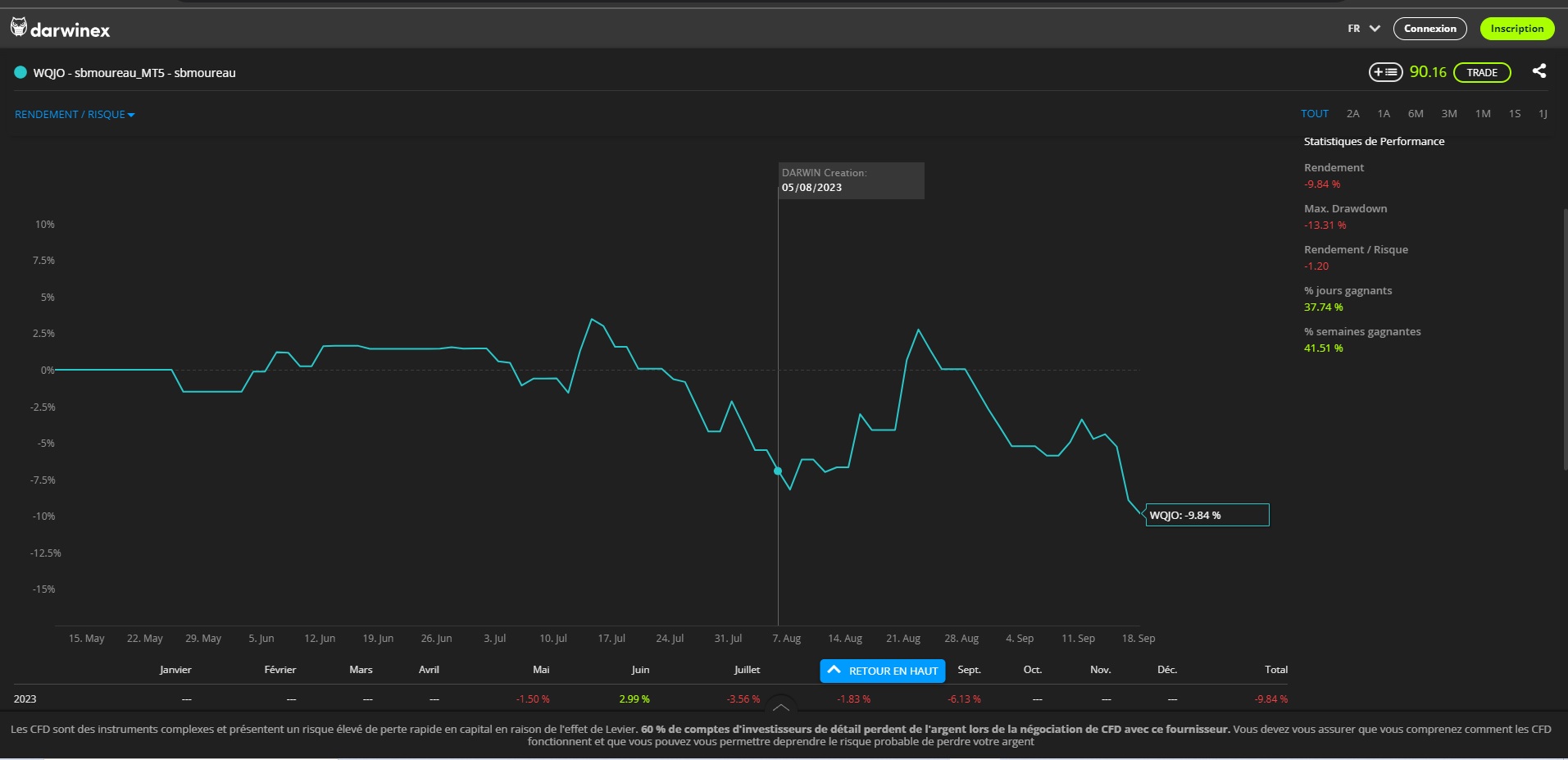 Je viens de trouver les résultats du Darwin de "SEBA TRADING" de la chaine Youtube du même nom : https://www.darwinex.com/fr/darwin/WQJO ... _view=true