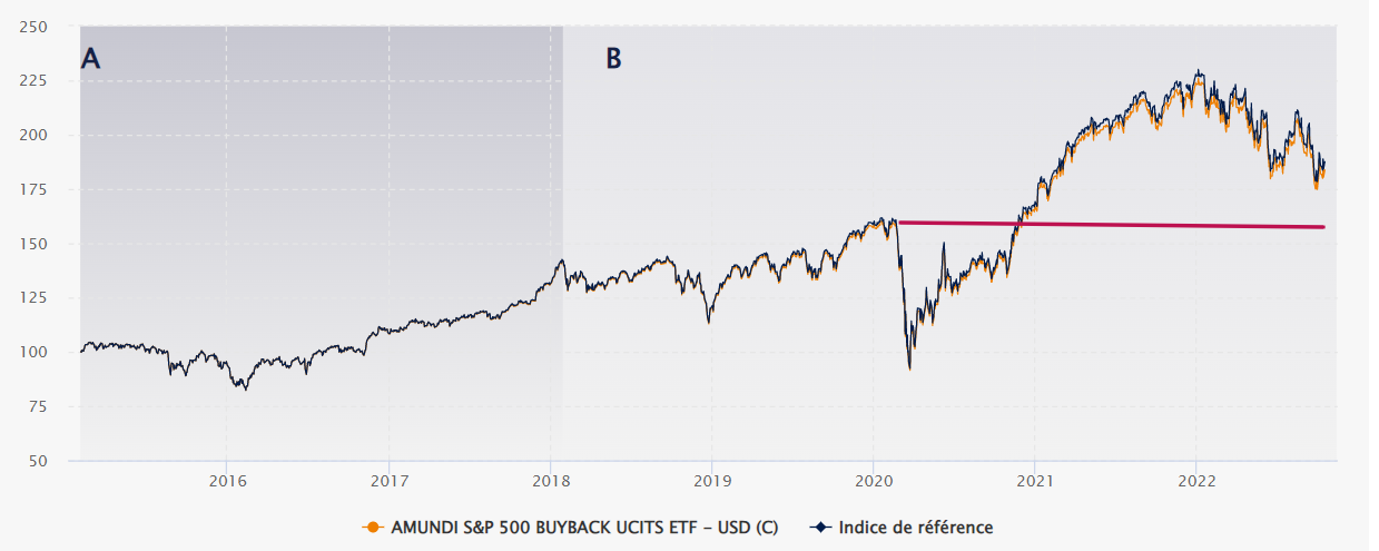 S&P 500 Buyback (dividendes nets réinvestis, libellé en USD), à la hausse comme à la baisse. Cet ETF permet une exposition aux 100 sociétés de l'indice S&P 500 ayant le ratio de rachat d'actions ('Buyback ratio') le plus élevé sur les 12 derniers mois, https://www.amundietf.fr/particuliers/p ... 1681048556
