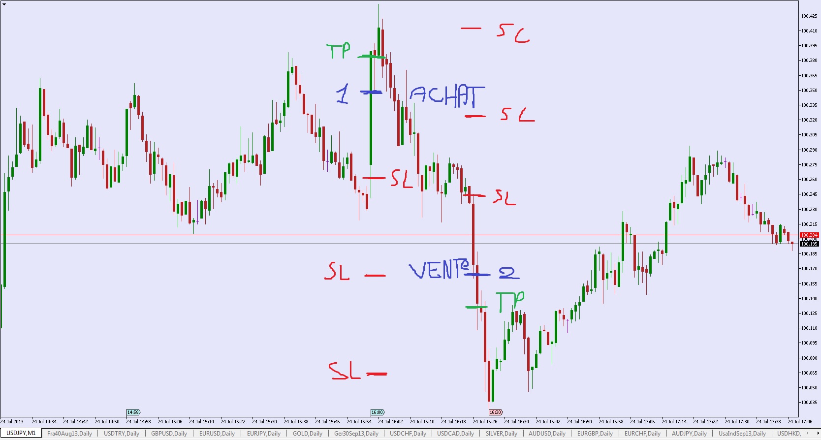 Ici on voit sur l'achat en bleu à gauche, un point d'entré en suivant une grosse bougie haussière, avec un Take Profit à 3 points en une fois, et 3 Stop loss d'un tiers de la position espacés chacun de 10 points.
