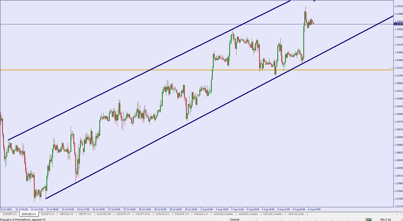 Je reste haussier. Ma dernière prise de position est à 1.31803 (06/08/2010 à 04h00 am) ce qui me laisse le temps de réagir. Pas de T/P fixé, je sors sur signal en H4 donc je vais aller le plus loin possible en fonction de ce signal de sortie clair.