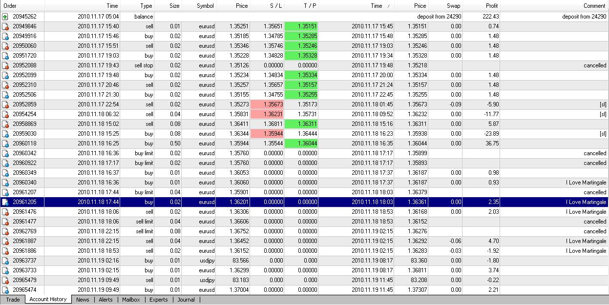 J'ai tradé selon plusieurs stratégies au niveau de mes points de sorties: moyenne à la baisse+martingale, martingale, objectif fixé en prenant positions sur plusieurs paires à la fois (EUR/USD et USD/JPY).