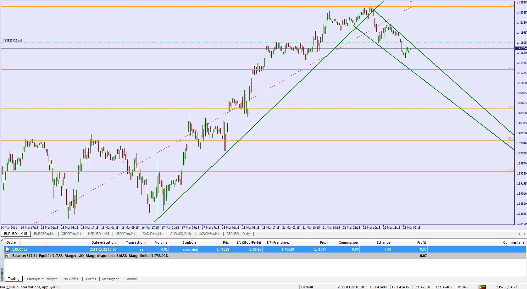 Moi, toujours short sur EUR/USD, pour le moment on a toujours bien la trend line qui a été cassée et on évolue dans un canal baissier court terme.
