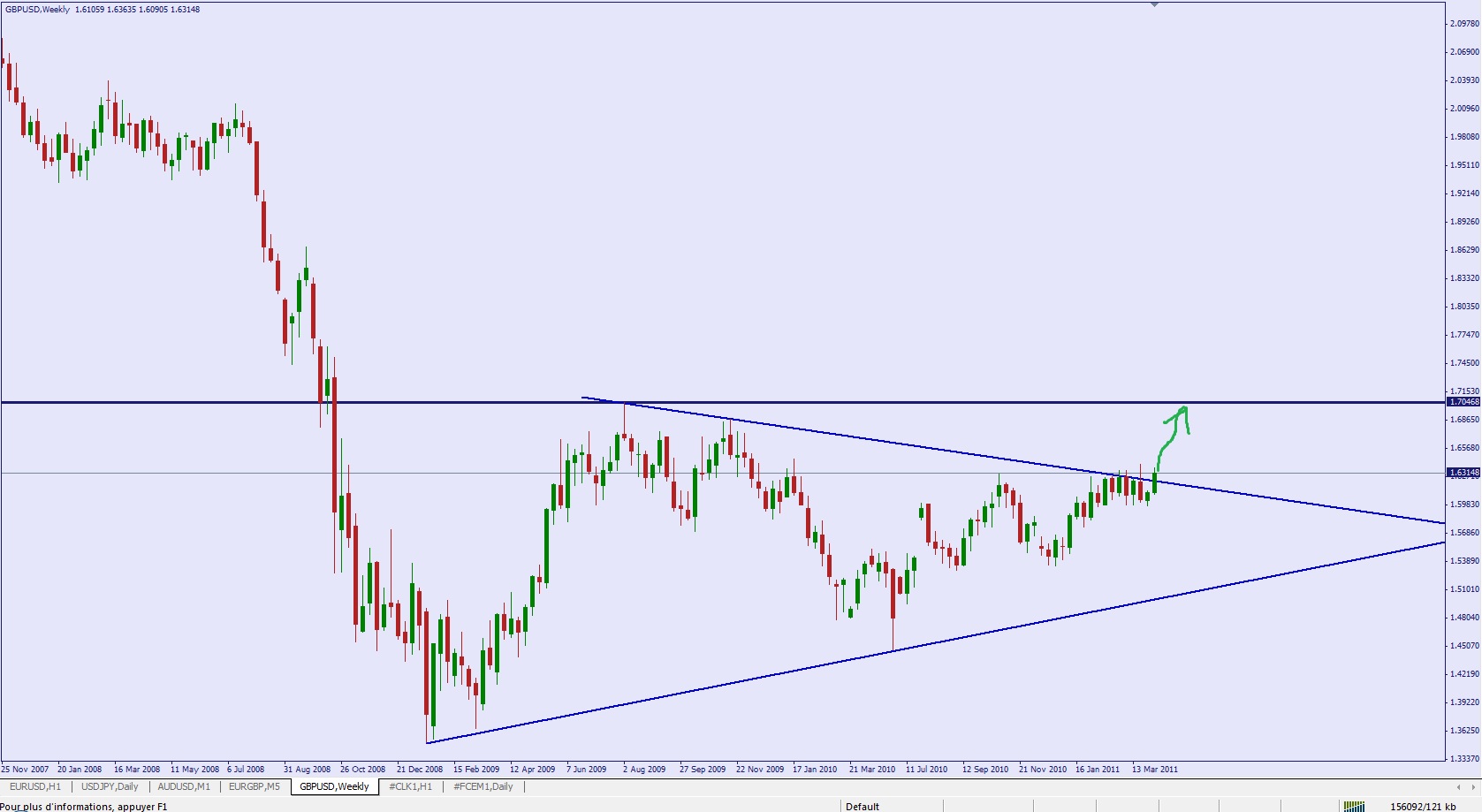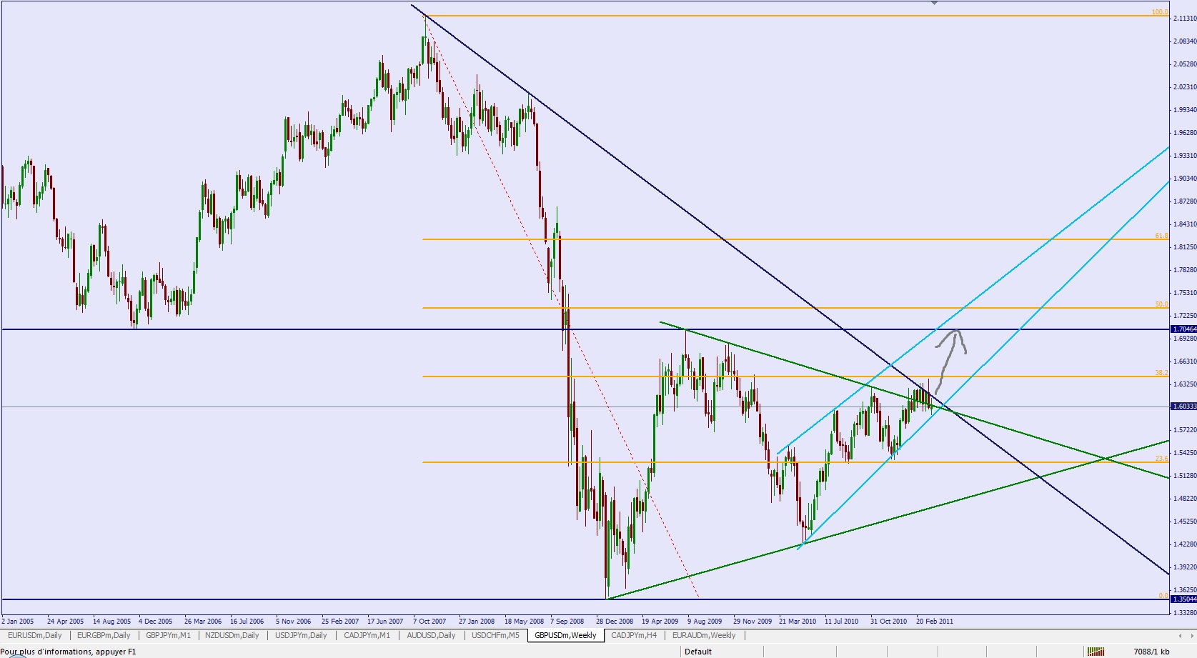 A moyen / long terme, ici en graphiques hebdomadaires, pour moi si on a une vraie cassure de la ligne de tendance baissière long terme je pense qu'il serait judicieux de prendre position à l'achat pour jouer le ralliement des précédents plus hauts à 1.7046.