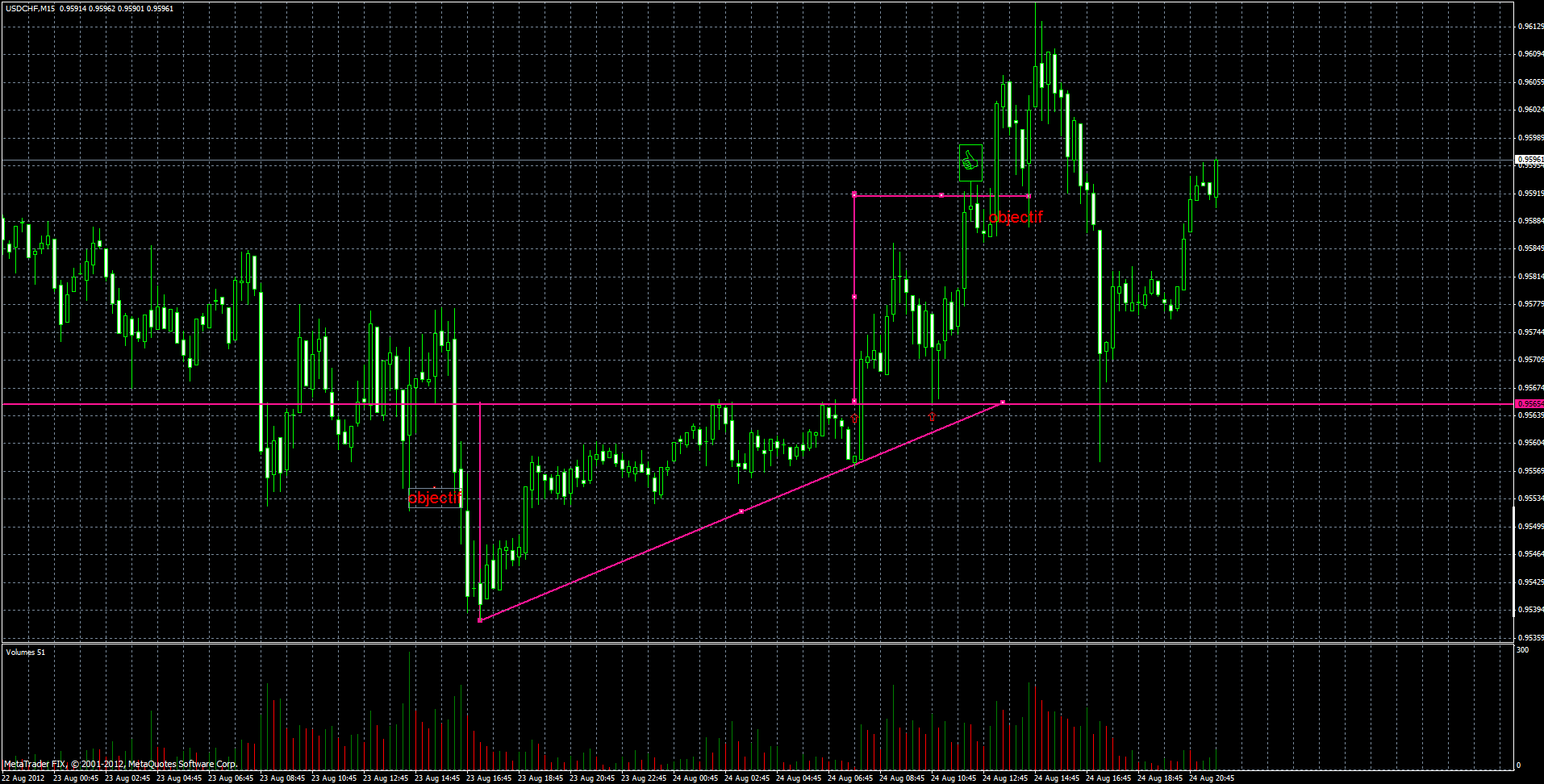 parfait, plus on voit de cas plus on pourra avoir de l'experience. si vous touvez de nouvelles figures bien net ou moin net, voir toute bizard, postez les ici pour qu'on voyent les limites de cette facon de faire, comment valider une figure en ce disant "oui c'est une figure bien net, ou correct" ensuite on pourra voir des cas comme celui réssament posté par Morgan62 qui permettent de bien voir dans quel limite poser son stop, ou comment le déplacer sur le prix d'achat rapidement ou apres le pull back, ou si il faut le laissé comme il était au dépard...humhum autant de réponce liee à l'experience et l'observation de cas divers et varié...
