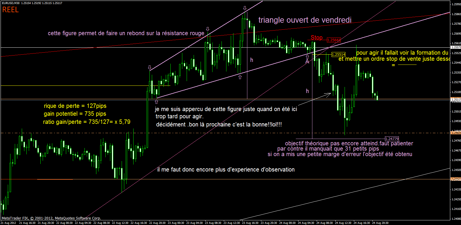 maintenant j'ai plus d'experience et continue de m'améliorer (selon moi). depuis quelque temps je regarde les figures et tente de faire des constatations et des testes. le trade que j'ai lancé sur le gbp usd est mon deuxieme trade plus long therme avec donc un stop plus grand. j'ai deja fait pas mal de teste sur des figures plus cour terme. mais entre les figures pas finit, les erreurs de positionnement de stop, les objectif pas atteind, et tous les trades fait qui n'ont pas lieu d'etre (=trade en dehord de ma stratégie), et ben je stagne. c'est pour ca que je suis sur que quelqun de plus affirmé que moi arrivera mieu a mettre en pratique. mais attention, je n'ai pas dit mon dernier mots.