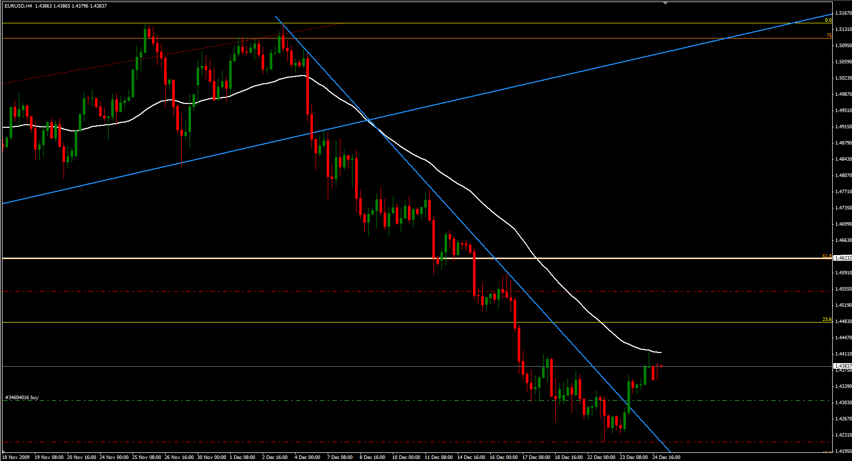 Pour NZD / USD comme Nouche s'est désister devant tant d'incohérence au niveau du money management du compte j'ai décidé de placer le Stop Loss au dessus du dernier plus haut (comme on le voit ci dessus en H4) et de placer le Take Profit à 0.7250 au niveau (juste au dessus) du retracement de 50% du mouvement baissier du 16/11/09 au 23/12/09.