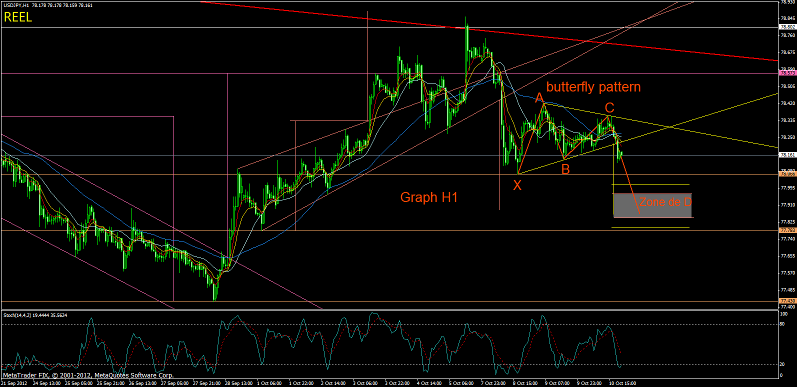 butterfly pattern sur H4 cette fois, toujours le usdjpy. on dirai que ses figure harmonic de robot sont tres utilisé sur usdjpy. il aime manipuler cette courbe???. alors on vois la premiere grosse buterfly pattern orange. la toute derniere mini en orange aussi que je vien de posté avant en h1, et en blanc une éventuel grosse butterfly pattern sur graph H4 qui suivrait directement la grosse butterfly pattern orange dont le point D avait tres bien été atteind. pour cette nouvelle butterfly pattern blanche il faut attendre le point d afin de la validé, mais on a bien le temps vu ou ce trouve la zone du point D