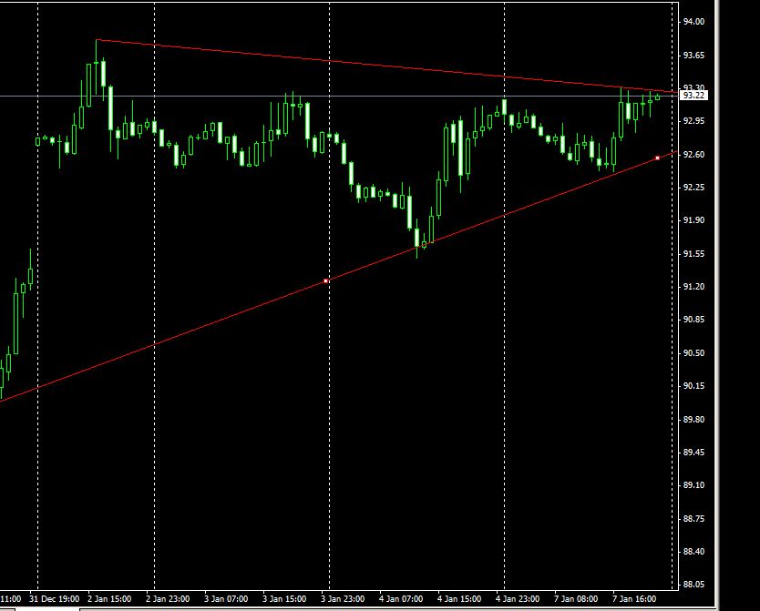 biseau d' élargissement ascendant en h1 et en h4 sur le crude. Objectif possible à la vente sur le dernier plus bas aux alentours de 92.70 qui est un bon support.