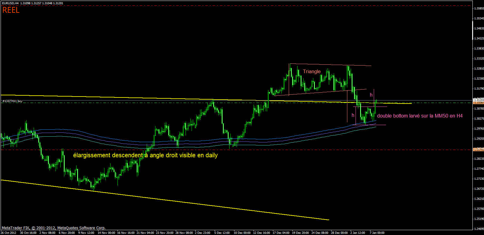 -eurusd en H4 ce double bottom larvé qui repose sur la MM50 est selon moi un pullback sur mon élargissement descendant à angle droit dont je parle plus haut.