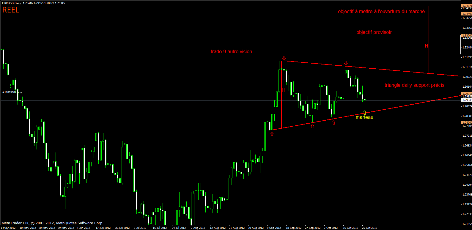 Alors voila Pierre03, voicia un superbe exemple pour la question que tu émmet sur la contre tendence. dans ma méthode, si une figure ce construie pile sur un support, j'agit alors à la cassure de cette figure avec confiance et détermination, car mon stop est alors bien placé par rapport à la figure.