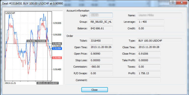 FXI685278766 – Ticket Size: 1K, Time for Matching: 1ms, Time for execution (MT4 to MT4): 299 ms, Slippage: Positive 0.1 pip, Taker: Goldman Sachs