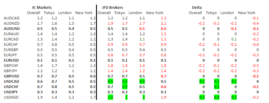 Vous trouverez ci-dessous un rapport qui compare les spreads de JFD Brokers a ceux d’IC Market.