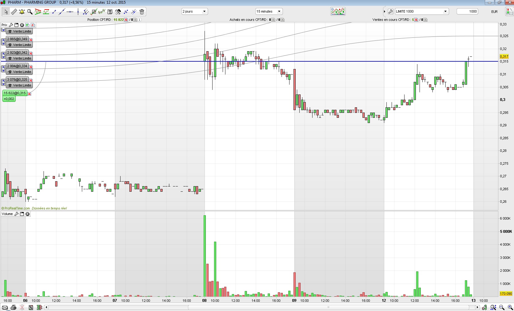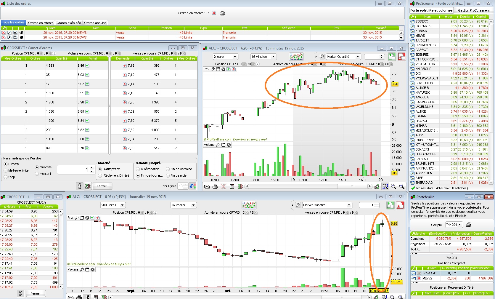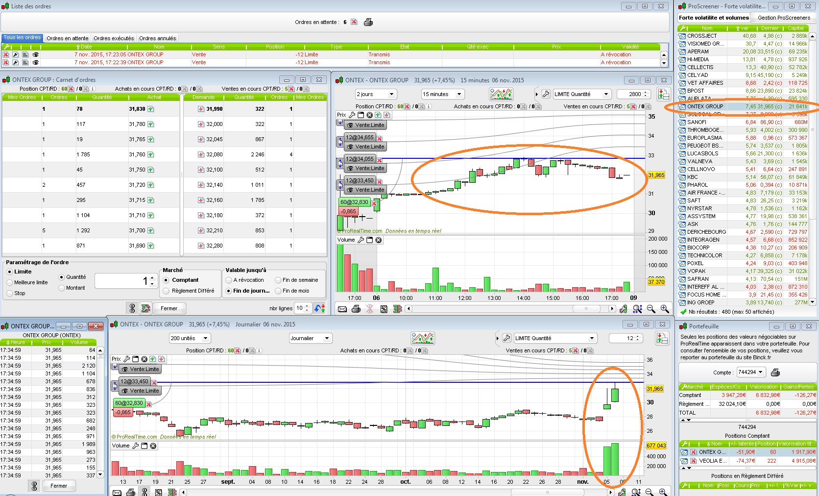Du coup j'ai acheté vers 14h l'action Ontex qui progressait bien, avec des échanges de plusieurs millions sur la journée, et des volumes quotidiens étoffés sans être excessifs. Malheureusement après mon achat on s'est un peu replié, mais rien de grave. J'ai donc placé mes 5 ordres de sortie tous les 2% pour lundi: