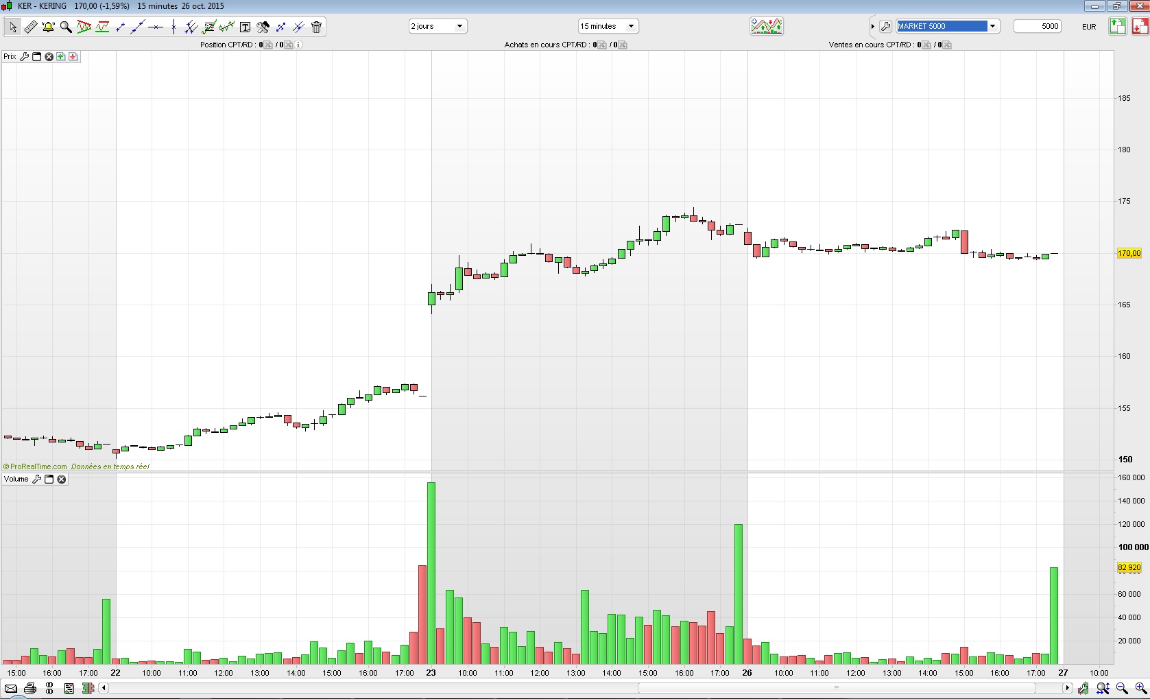 Vendredi j'ai acheté, toujours pour 5000€, l'action Kering qui avait pris plus de 10% avec un fort volume et un intérêt souligné des investisseurs en fin de séance: