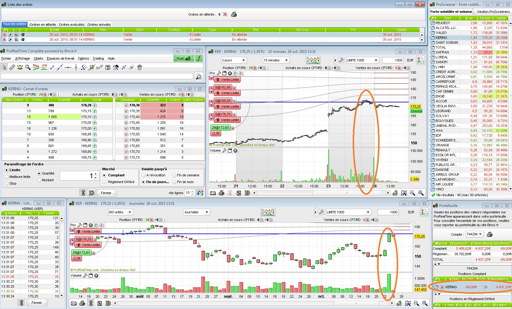 Du coup j'ai acheté vers 14h l'action Ontex qui progressait bien, avec des échanges de plusieurs millions sur la journée, et des volumes quotidiens étoffés sans être excessifs. Malheureusement après mon achat on s'est un peu replié, mais rien de grave. J'ai donc placé mes 5 ordres de sortie tous les 2% pour lundi:Je n'ai pas pu fermer ma position acheteuse sur Veolia, qui aurait normalement du l'être à partir de 17h, donc je la fermerai lundi matin. Concernant cette dernière, on a essuyé une légère perte vendredi:Concernant les derniers jours lors desquels je n'ai pas fait de point, voici la liste des ordres passés:Le compte affiche actuellement 10 780€ soit un profit de 780€ depuis son lancement il y a presque 1 mois maintenant.