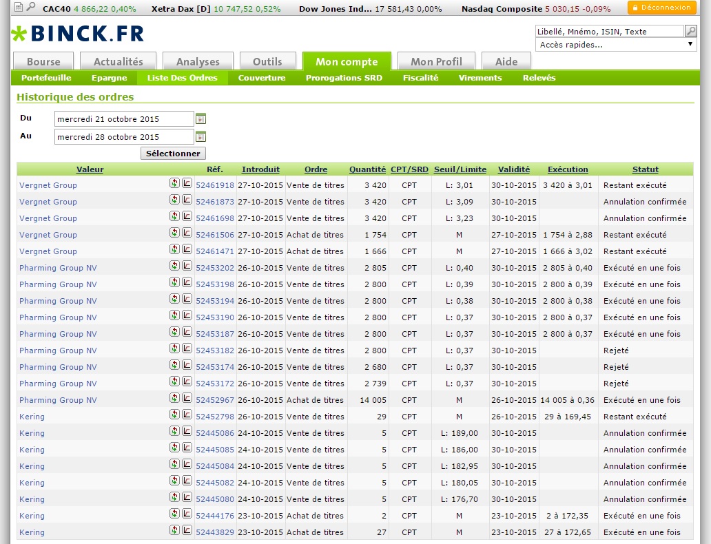 Voici donc pour le moment ce que j'ai fait depuis que j'ai commencé jeudi:A noter: étant nouveau client chez Binck, je bénéficie de l'offre de bienvenue, et ne paye pour le moment aucun frais de courtage jusqu'à atteindre l'équivalent de 1000€.