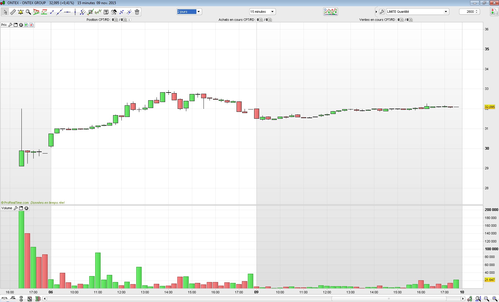 Ensuite, on passe à l'étude du graphique 15 minutes pour étudier le comportement des investisseur au cours de la séance écoulée (exemple avec ma position du jour):On regarde donc ici comment s'est déroulée la hausse. Idéalement on recherchera un fort engouement en fin de séance qui permet de terminer sur ou proche des plus hauts avec de forts volumes, ce qui traduit un fort intérêt.