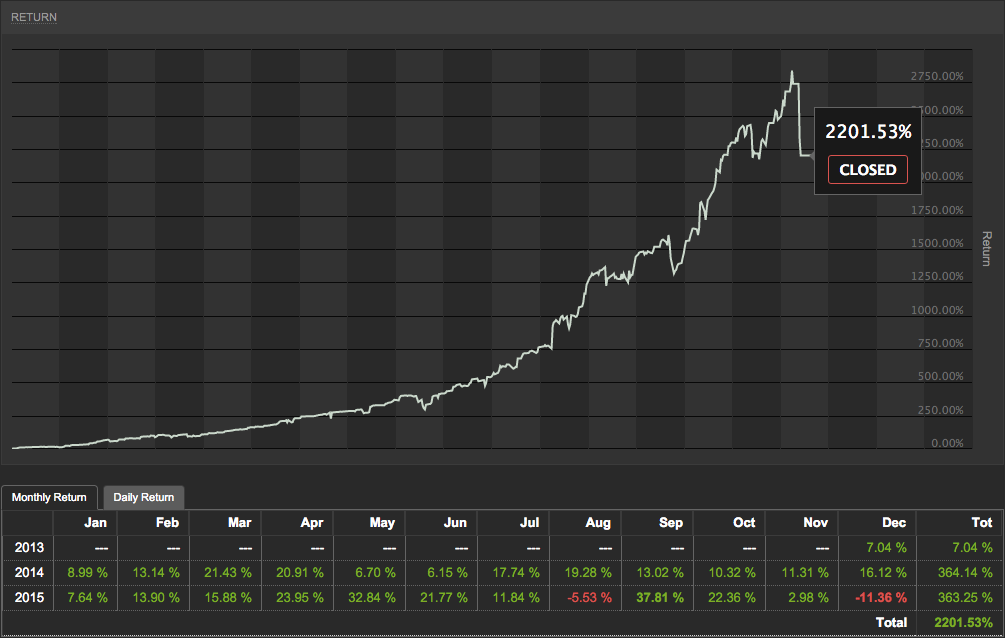 Si vous observez les résultats mensuels, vous constaterez que l'algo booste notablement le résultat sur le Darwin, et lorsque le trader fume le compte, il protège le Darwin qui s'en sort avec un DD raisonnable.