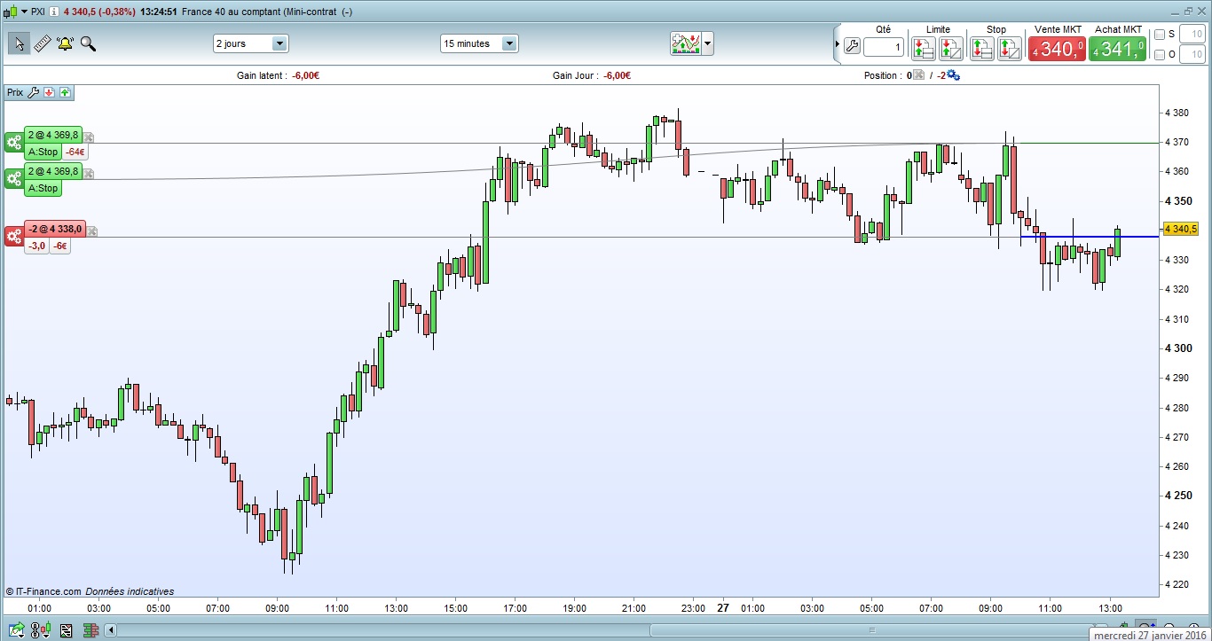 Non, uniquement hier donc le 8 janvier 2016:En effet, la stratégie prend un premier trade lors de la cassure du range de la première demi-heure de cotation, avec un stop loss et un ordre inverse en dessous ou au dessus de l'autre borne du range du matin. Sur cette seconde position éventuelle, le stop loss est alors au niveau du premier point d'entrée.arcadiabay a écrit :Bonjour Fabien,