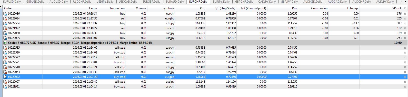 pour résumer une fois par moi je pose tout les ordres stop sur les 18 parités et chaque soir je fait le point des positions , soit je coupe en gains soit je suis stopé.