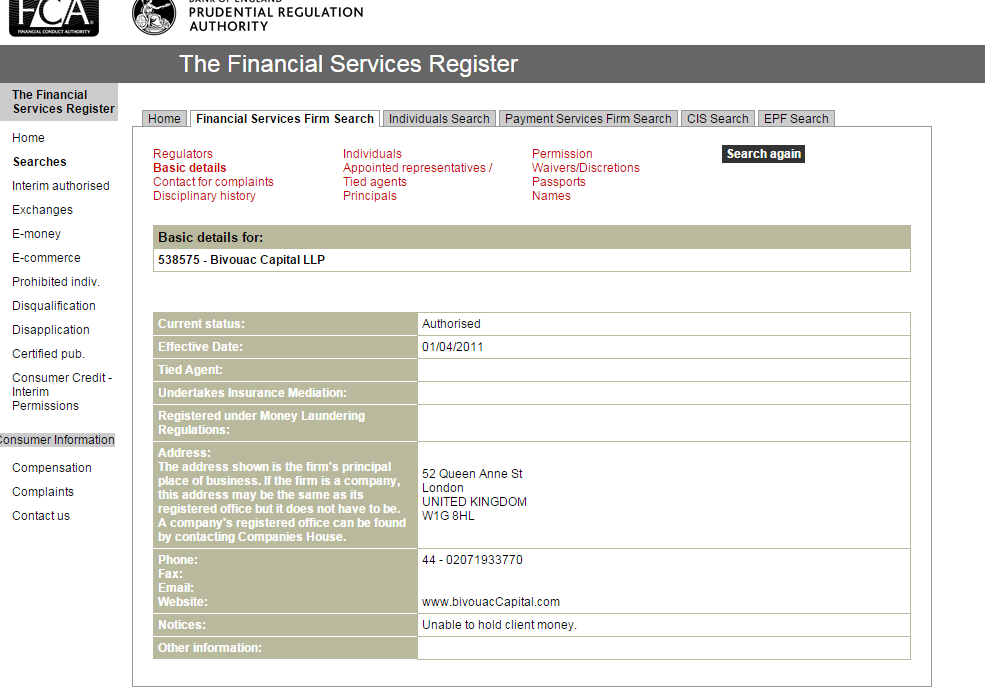 La licence qui autorise GMA Finances a gérer les fonds est une licence au nom d’une societe anglaise - Bivouac Capital LLP. La licence existe bien mais le lien entre Bivouac Capital LLP et GMA Finances est impossible.