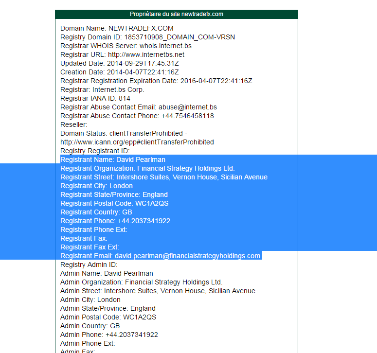 Pendant ce temps, j’ai pris le temps de vérifier sur le site (pendant que j’étais au téléphone) et j’ai pu trouver que la société en question s’appelle Financial Strategy Holdings Ltd et qu’elle est régulée à Belize. Voir impression écran ci-dessous :