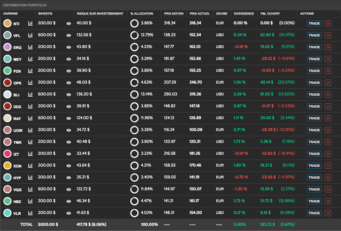 Colonne Invested : allocation par Darwin