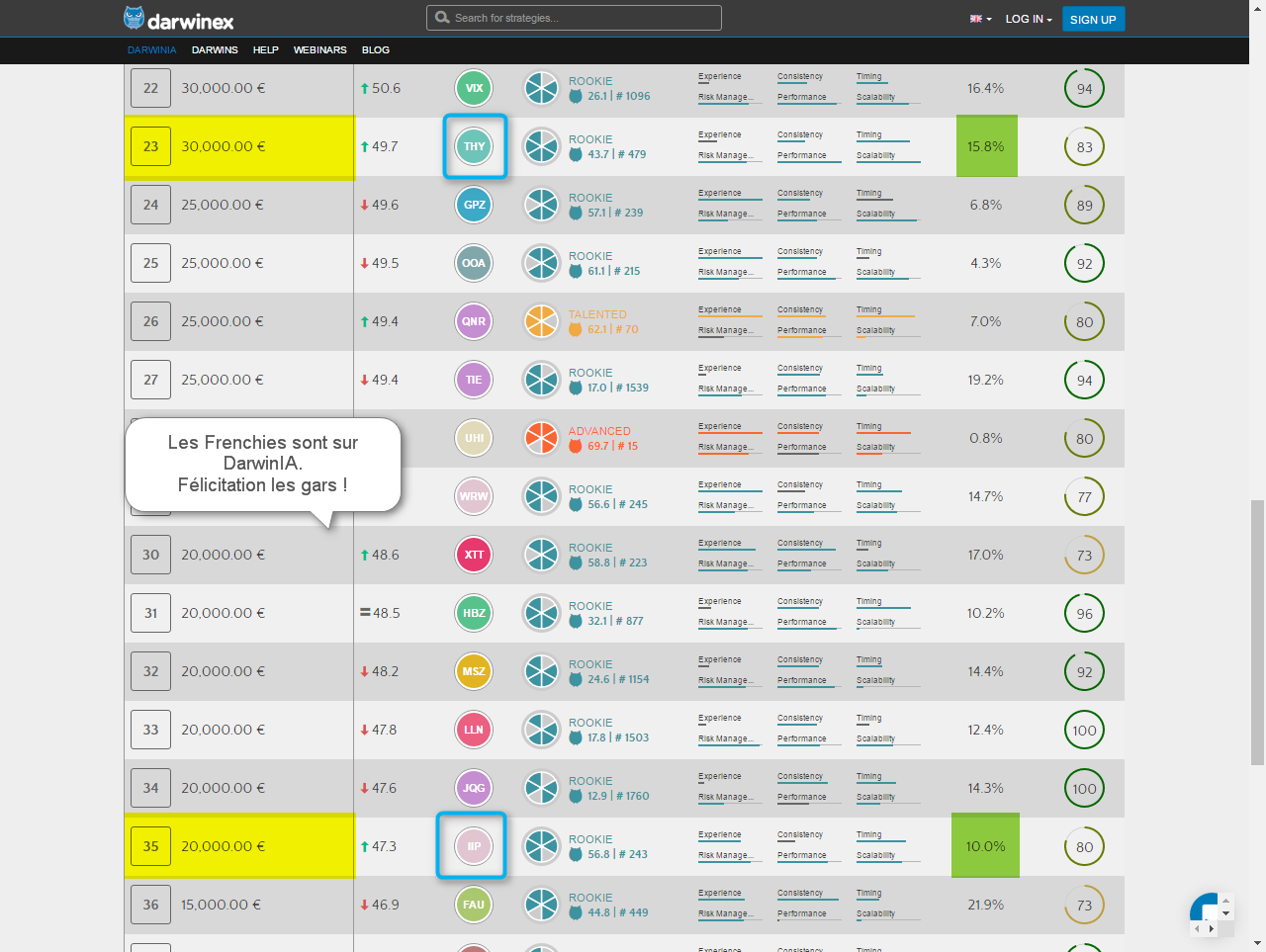Pour info, le mois dernier XXR a eu besoin à mes souvenirs d'un D-score de 54, d'un grade Talentueux, de 97% d'activité et d'un rendement de 10% pour se classer au final 18ème tout en ayant percé à quelques jours de la fin en 7ème position et c'est là que lorsque l'Activité des gros D-score (type > 70) atteint 100%, on se met à chuter sans pouvoir rien y faire !! J'aime pas DarwinIA. :lol: :lol: :lol: