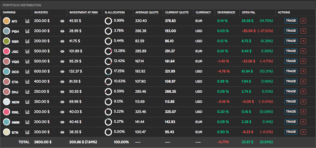 Ma limite à 12 Darwins semble éviter une trop grande dispersion, et le fait d'utiliser mon compte d'investissement démo avant d'acheter en réel est une grande avancée. Car mon compte démo est très très rouge.