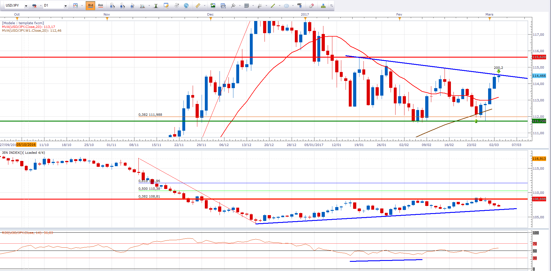 USD/JPY : range 111.8 - 115, je vous avais dit attendre le point bas de ce range pour me positionner long. Entré du coup 5 jours après l'interview, hier sur cette zone. 111.8 c'était le point que je proposais (on a fait au plus bas 111.68). Et là, ceux qui ont suivi sont à 200 pips de gains en quelques heures.