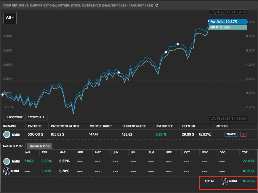 Au lieu de cela, la positions a été ajustée parce que dans l’intervalle de 15 à 30 minutes, l’effet de levier était en dehors de la plage de la dispersion maximale tolérée et était beaucoup plus élevé que sa médiane historique. Le résultat dans ce cas est que le trader a clôturé positivement ladite position (+0,44%), malgré que le profit du DARWIN ait été réduit de 40,2%. On pourrait donc dire que, dans certains cas, notre Risk Manager surprotégeait l’investisseur.