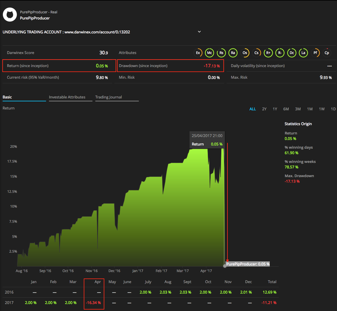 En effet, si le Darwin CTA à subit une perte de -7.15 % en avril soit effaçant les gains de 2017, son compte à subi en avril une perte de -16.34 %, soit plus du double de la perte constatée sur le Darwin.