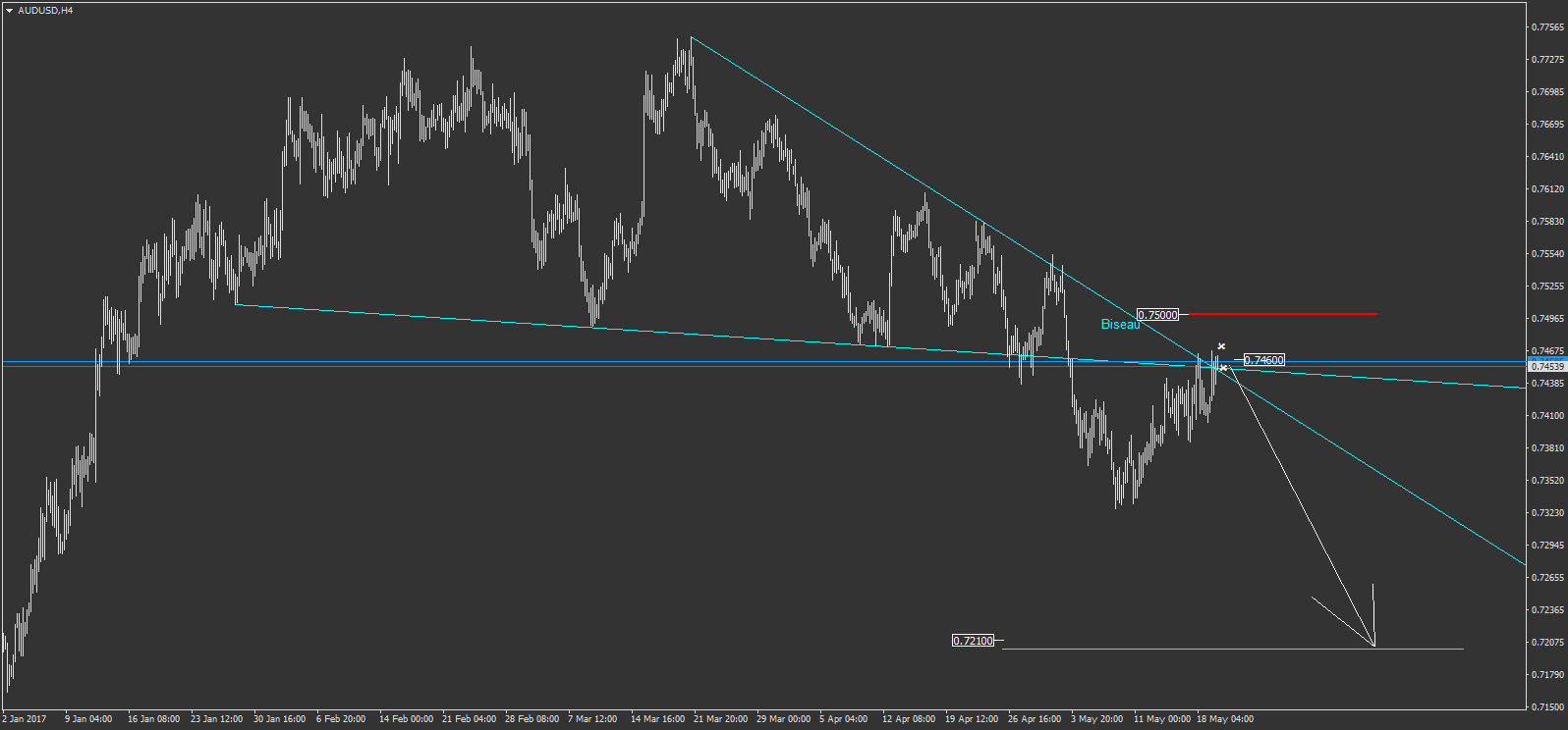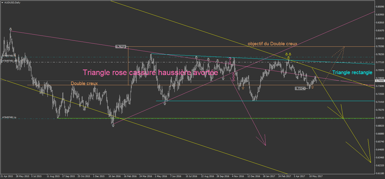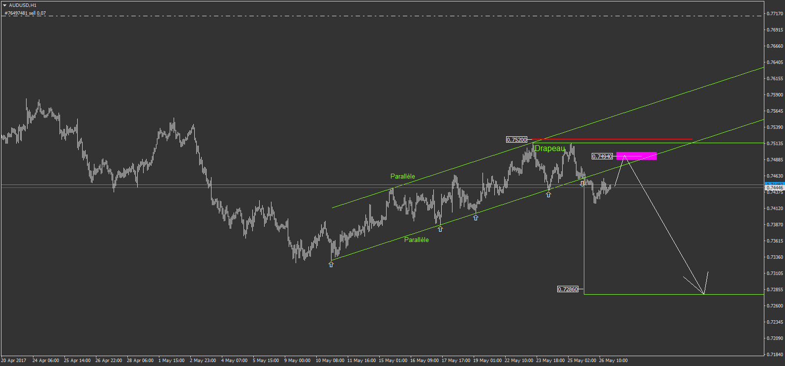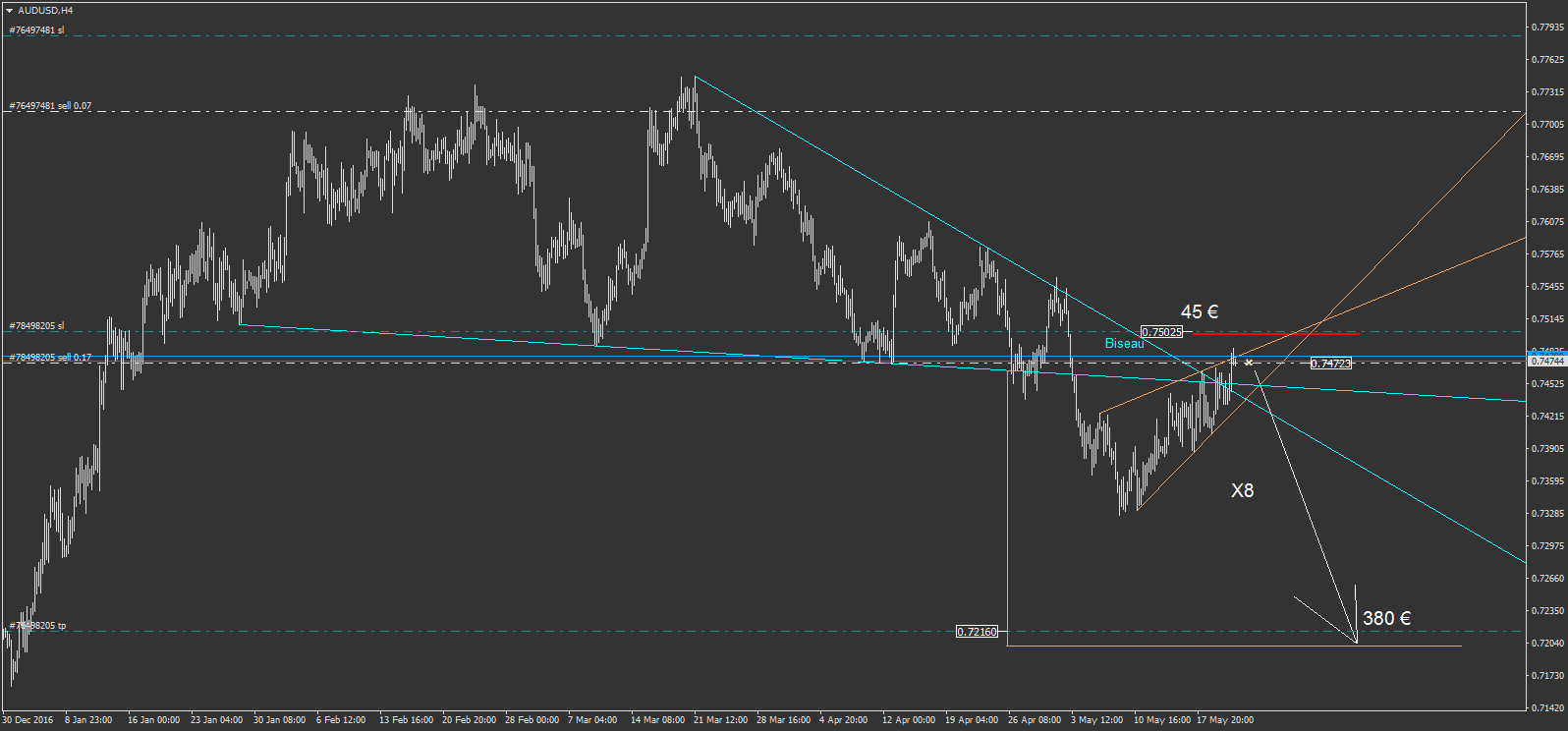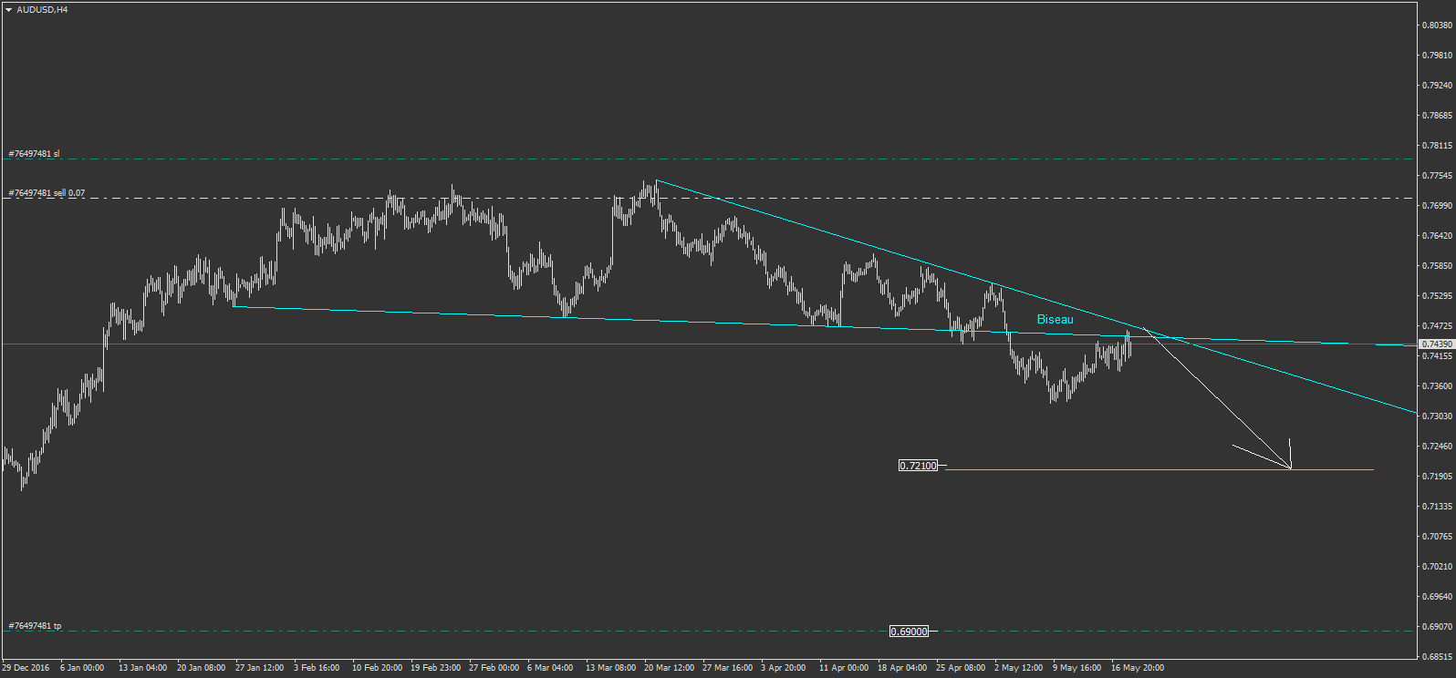Sur le AUDUSD une analyse me donne un point d'entré sur les niveau proche de 0.74000 à la baisse stop à 0.75000 et objectif du biseau 0.72100