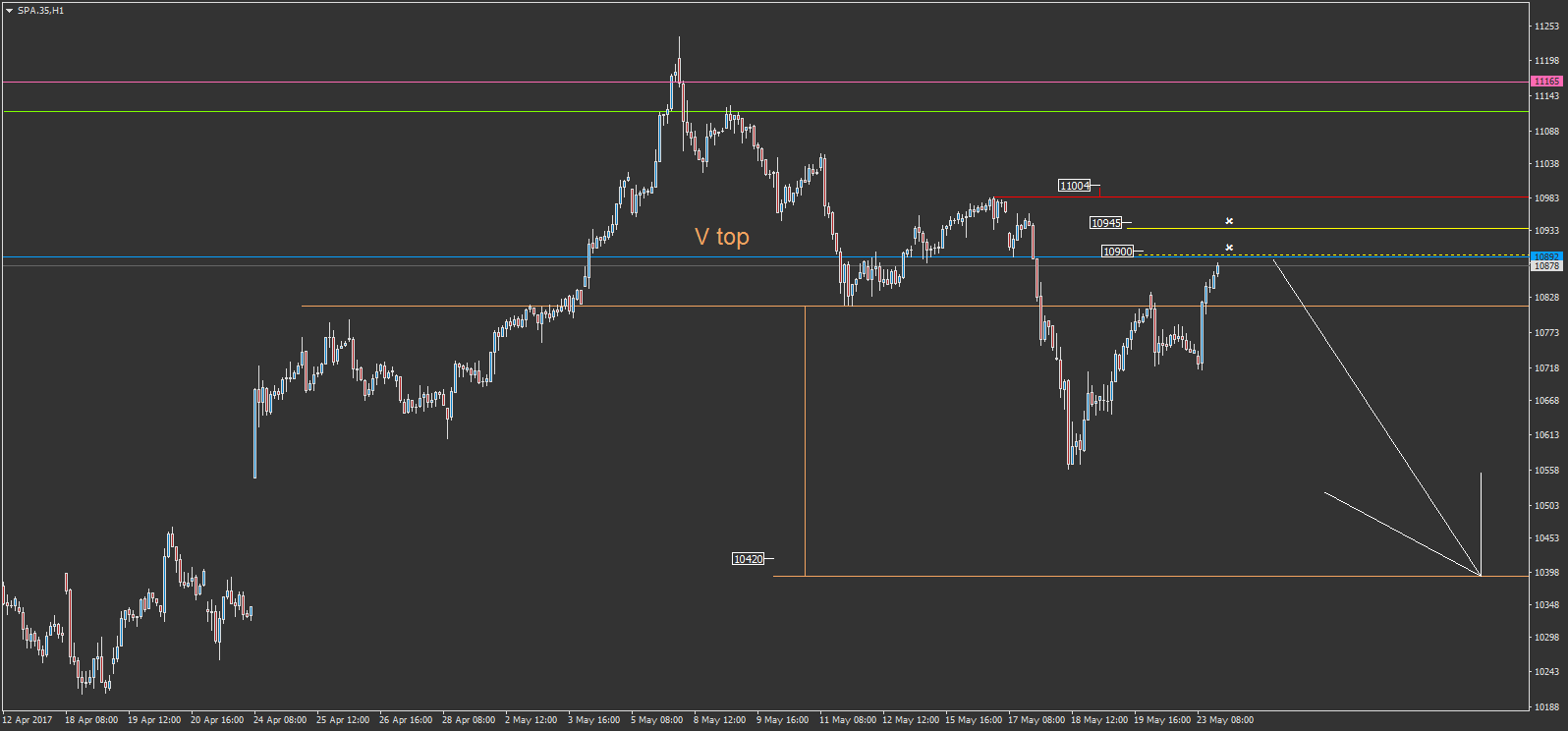 sur Le SPA.35 voici une image, il y a toujours le V top ou j'ai eu le prix du haut de ma zone (vendu à 10940. un fanion c'est rajouté avec un objectif à 10500 plus bas, il y a l'objectif du V top , j'ai pris 10420 comme objectif. mon stop reste le même à 11004.