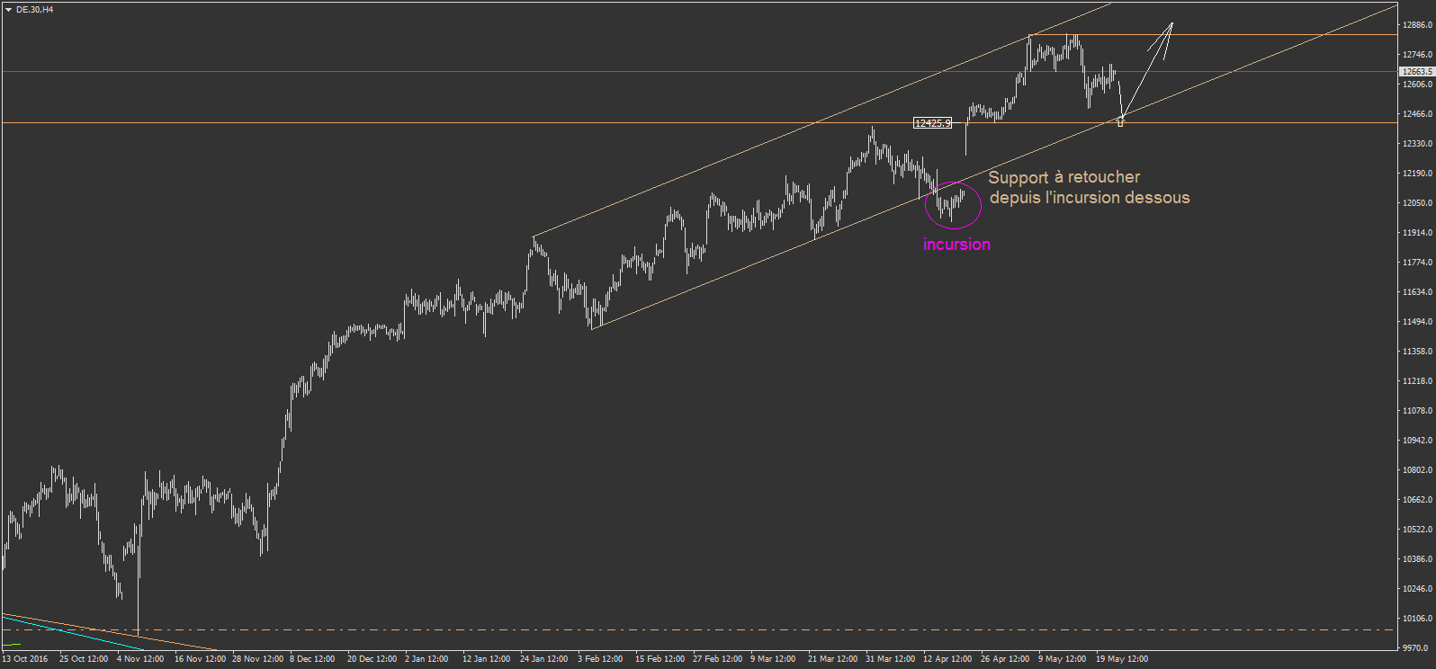 TIEN TIEN!!! sur le DE.30 (DAX30) il y a un scénario très intéressant! il y a un triangle vert 3 point précis sur le support et 3 points précis sur la résistance. et il y a un ancien support gris qui doit être retoucher selon moi. donc!, il peut y avoir une fausse cassure baissière, juste pour toucher le support gris, puis une réintégration du triangle vert, avant de le casser finalement par le haut!!!! cela reste un scénario intéressant, car les objectifs théoriques sont haut pour un stop serré, reste à trouver où rentrer un position. bien entendu, rien ne garantie la réussite de ce scénario qui n'est finalement qu'un hypothèse, bien que lié à une étude poussé de certain éléments.. en effet aussi poussé que puisse être une analyse, la plus simple des analyse, pet être la bonne aussi. et oui, c'est comme ca!!!