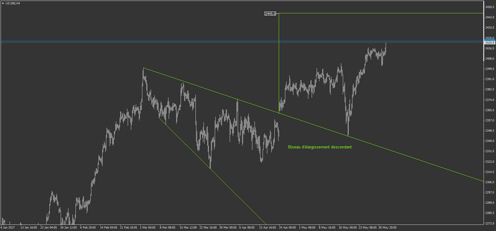 Sur l'US.500 le biseau d'élargissement descendant à angle droit poursuit sa course vers son objectif des 2445.0