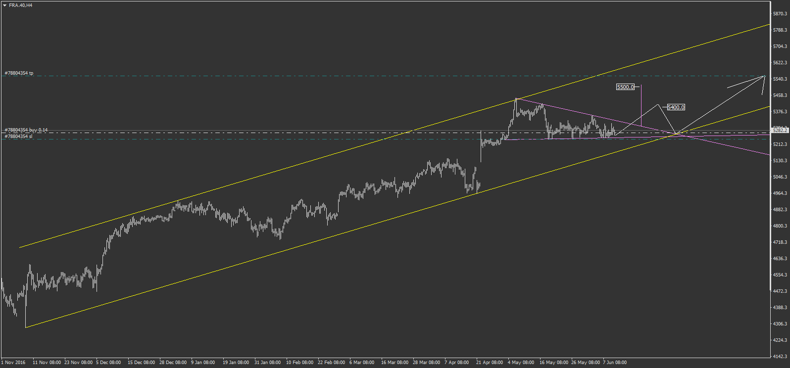 Concernant ma position sur le FRA.40, le triangle d'origine, c'est transformé en un nouveau triangle qui je pense devrais casser vers le haut, si c'est le cas, alors je pourrais fermer plus tôt que prévu, vers les 5400.0 si la cassure ce réalise assez vite, l'objectif du triangle sera vers les 5500.0 au moins. mais il y a aussi à prendre en compte le canal jaune de tendance haussière. et après la cassure, il y aura peut être un pullback pour reproduire le canal jaune, et donc un nouveau point d'entré pour les fan de triangle. c'est pourquoi, je prendrais mon objectif vers les 5400.0 si on y viens directement après la cassure. il y a aussi la possibilité de faire une fausse cassure baissière du triangle juste pour toucher le canal jaune et remonter seulement ensuite.