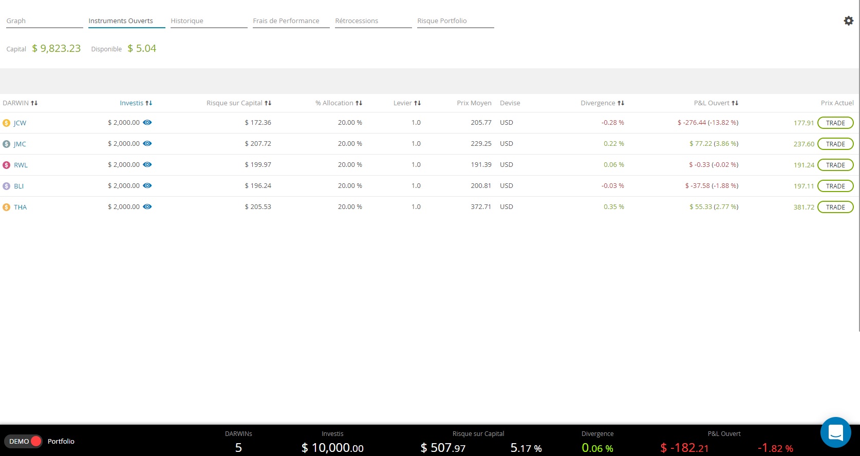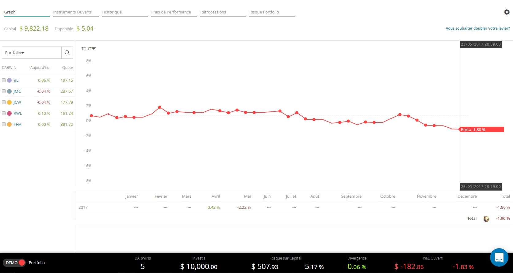 Je me suis alors créé un nouveau portefeuille avec 5 Darwins pour le moment, qui affiche une perte de 1,80%
