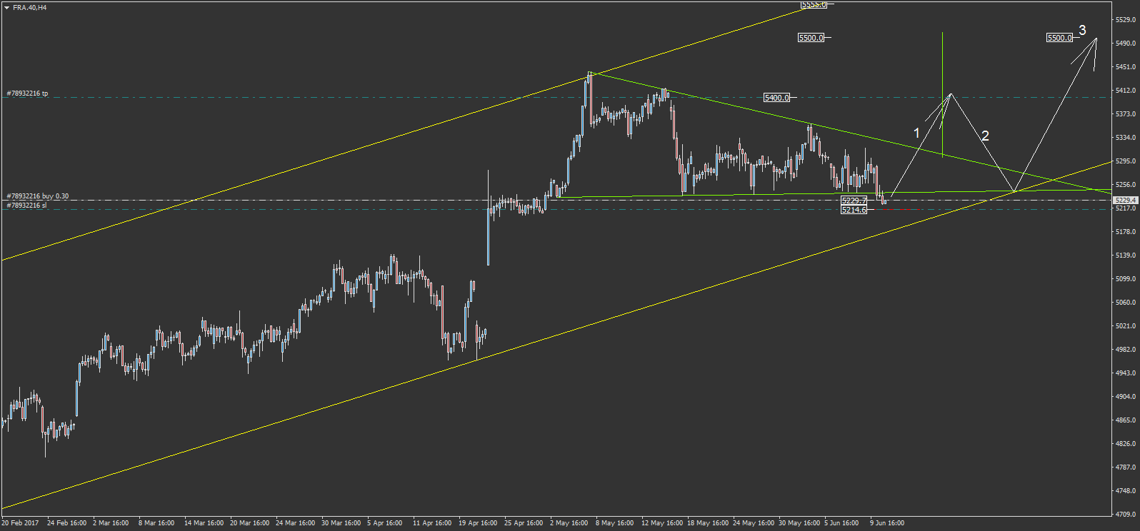 Sur le FRA.40 j'ai modifier le support, je pense que la fausse cassure qu'il y avait eu à la baisse, est en faite la fausse cassure de l'horizontale, ce qui dans ce cas forme un triangle rectangle avec pour base une ligne droite où il y a eu une petite incursion. on est revenu confirmer cette horizontal hier. ce qui pour divers raison me donne un signal d'achat sur ce niveau. tant que l'on ne revient pas sous le bas le plus bas de l'incursion (à 5222.