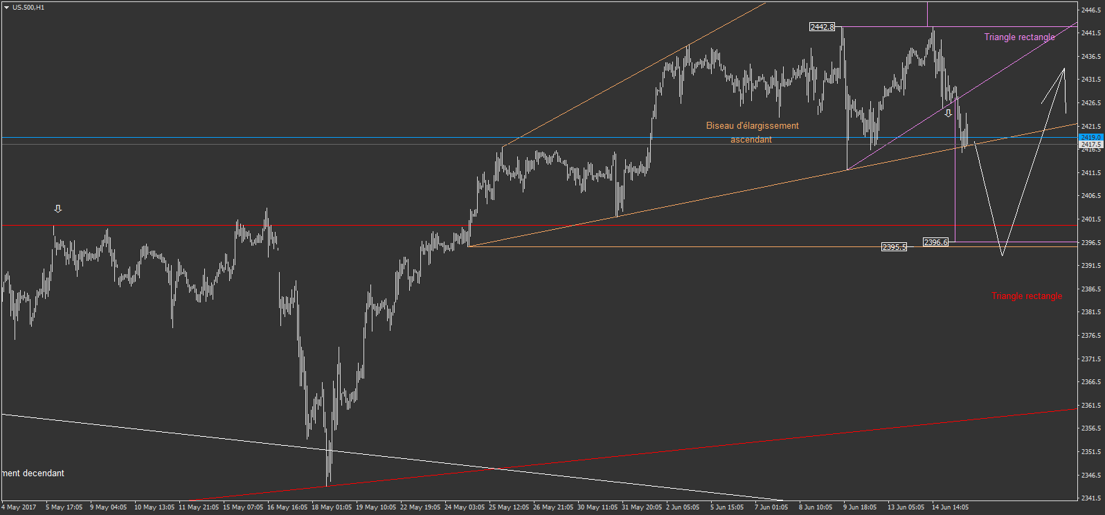 Sur US.500 je me suis mis un ordre différé pour une baisse imaginé. on voit un gros triangle rectangle sur lequel j'imagine un pullback, retour sur ce triangle qui pourrait ce faire grâce à un biseau d'élargissement ascendant comme on le voit sur l'image. j'ai un stop de 45€ pour un petit objectif de 225€