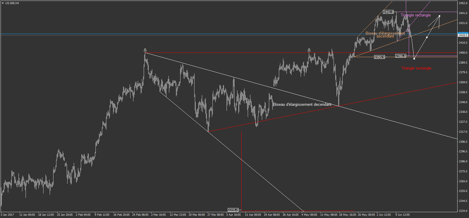 sur l'us.500 le biseau d'élargissement ascendant semble vouloir casser à la baisse avec hésitation. si il est cassé, on ira alors théoriquement à son objectif baissier qui n'est pas bien loin de l'objectif baissier du triangle rectangle déjà cassé à la baisse.
